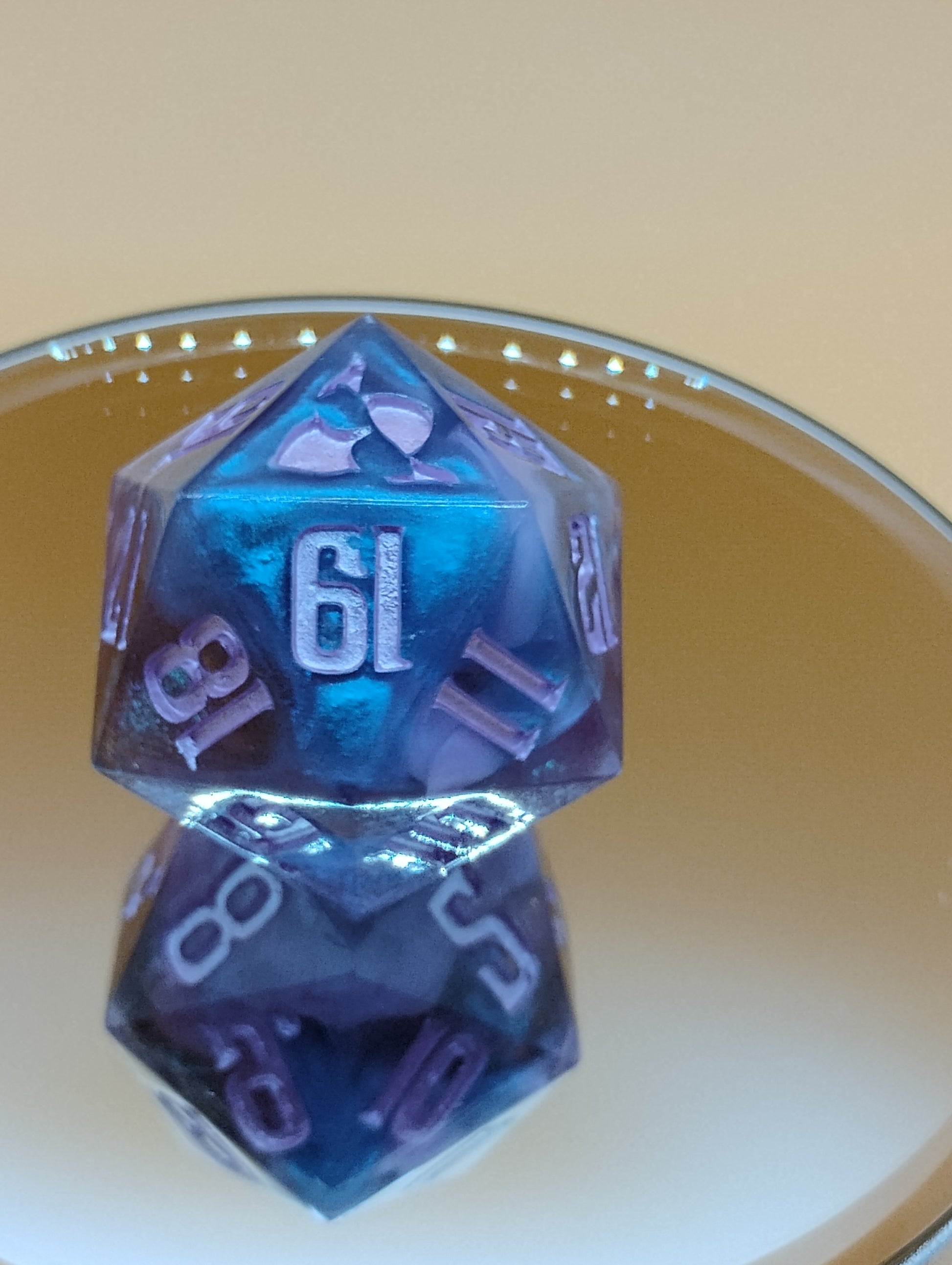 Channel eldritch power with the Arcane Eclipse 38mm Spindown, a massive handmade life counter shimmering with stormy violet, midnight blue, and hints of feylight purple. Crafted with care, sanded, polished, and inked by hand, this spindown is a ritual object worthy of your next Magic: The Gathering duel.