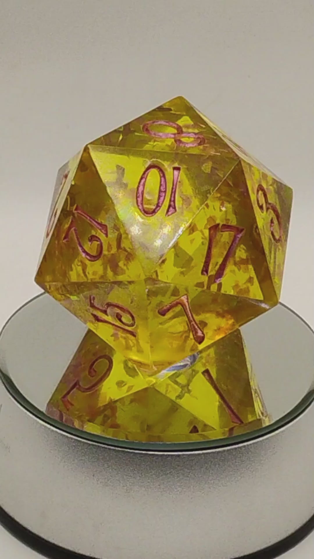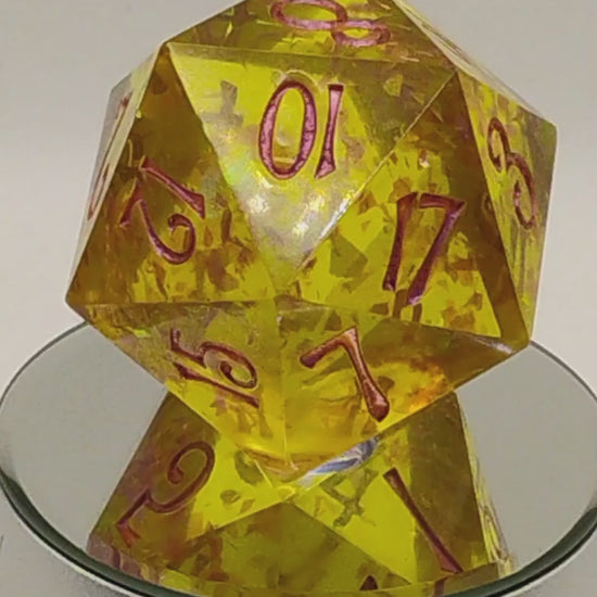 Command the table with the Blush Colossus, a breathtaking 78mm handmade D20 crafted for those who believe bigger truly is better. Cast in translucent resin and filled with radiant pink iridescent glitter, this monumental die catches the light like a gem forged from starlight and charm. Each face shimmers with soft, shifting hues — a spell of beauty and power in motion.