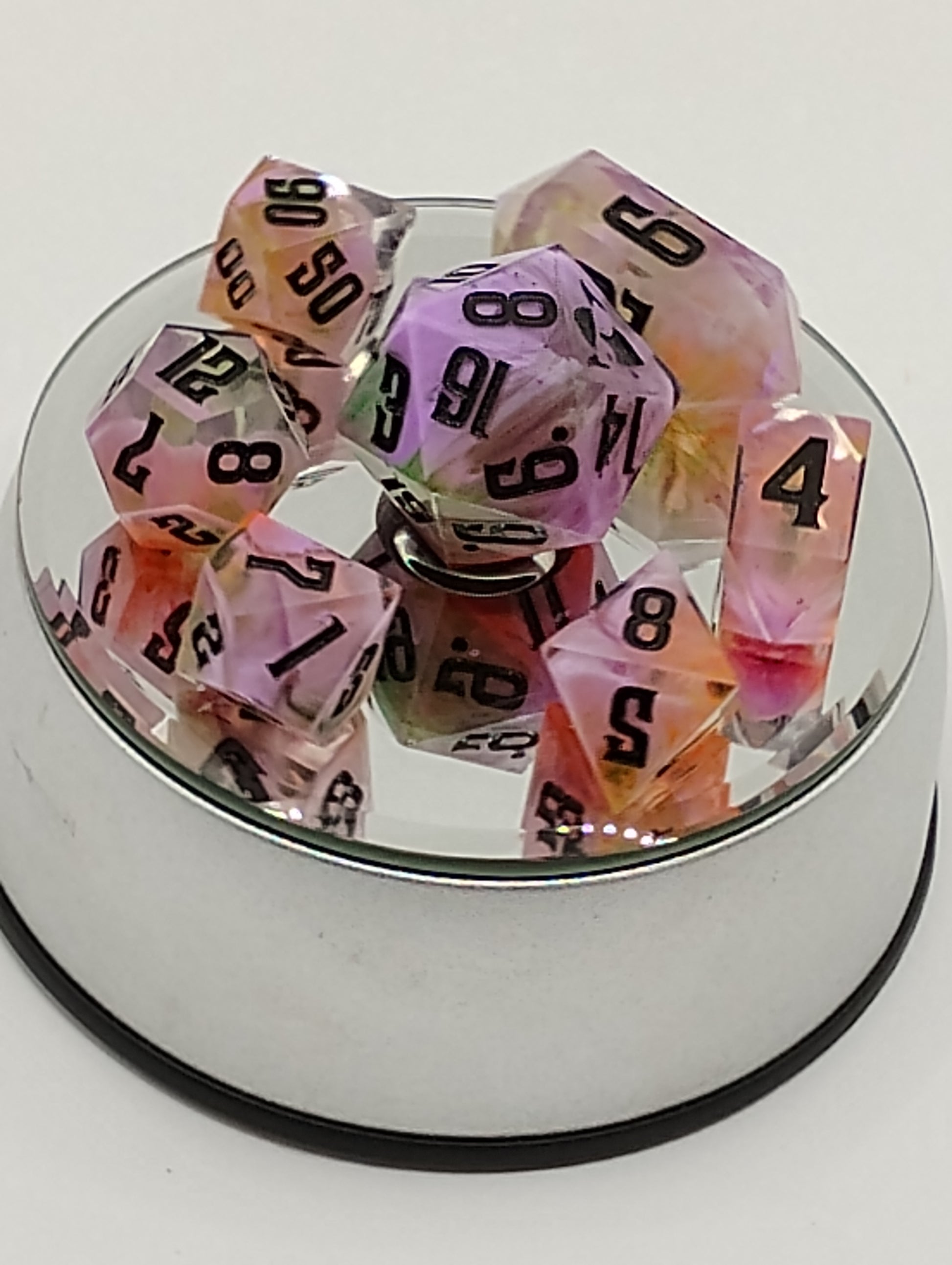 From the brink of light and darkness comes a dice set unlike any other. Hand-poured in crystal-clear resin, each die swirls with neon sherbet colors of purple, orange, and yellow, while black inked numbers strike with dangerous clarity. Every edge is hand-sanded, polished, and sharpened by Nat20Dicery, making this standard 7-piece set a luminous shard of fate ready to roll chaos and wonder.