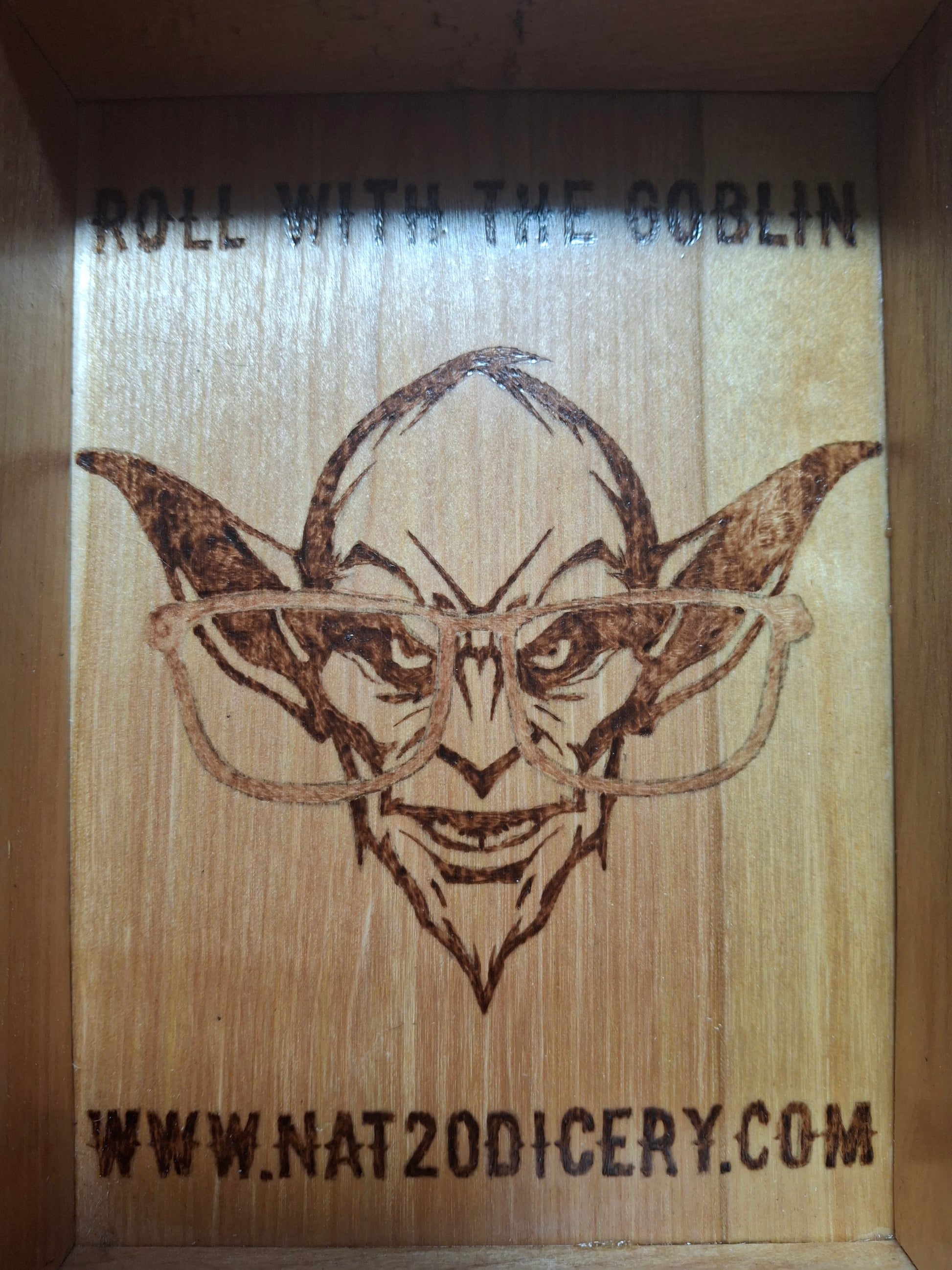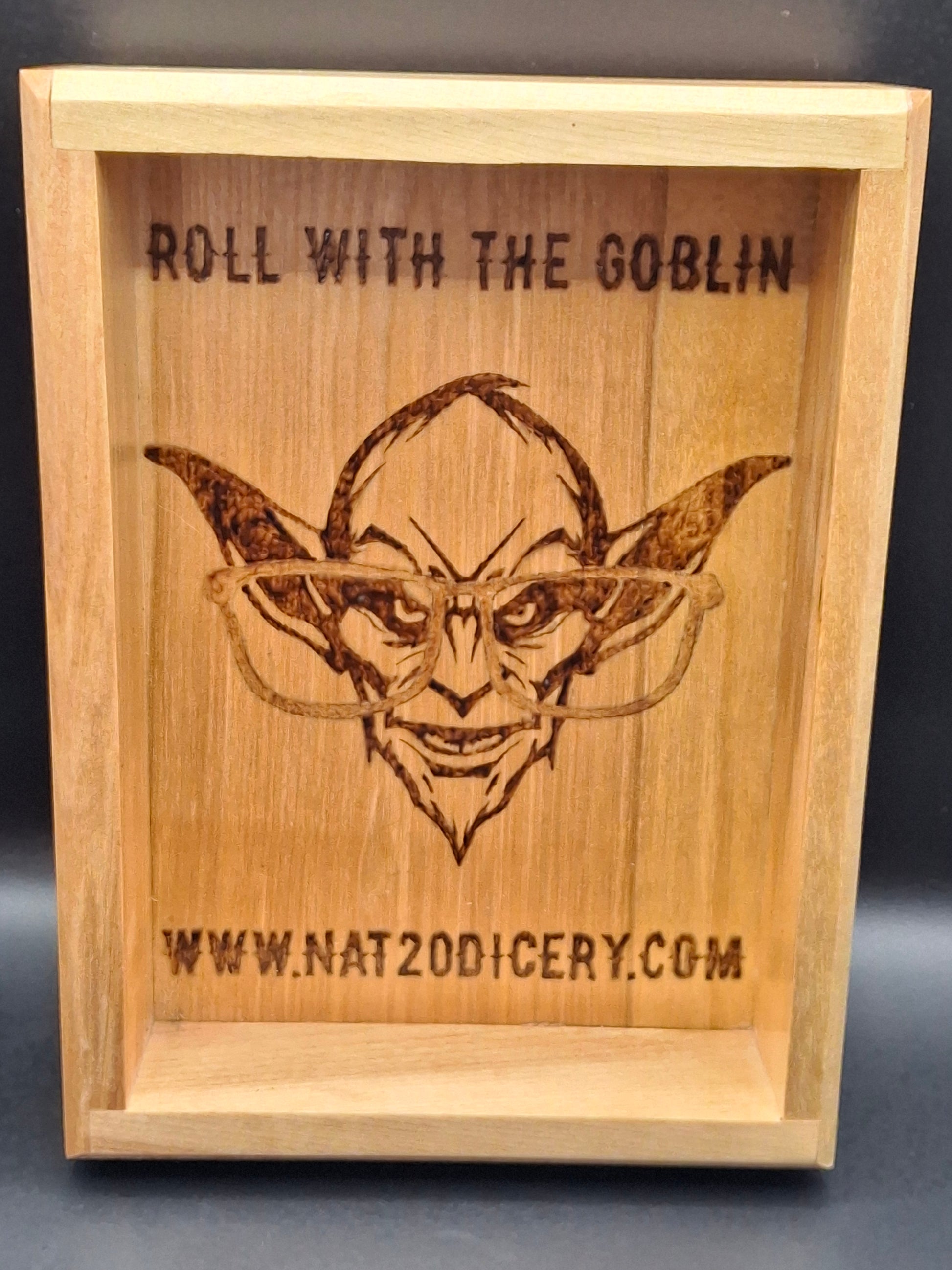 Built using traditional peg construction—no nails, no shortcuts—this tray blends fairy tale charm with old-world durability. But what truly sets it apart is the hand-burned likeness of Nat 20 Dicery’s infamous Dice Goblin, grinning mischievously from the wood like a trickster spirit bound in pine.