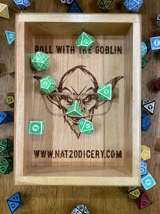 Goblinlight Grove – Handcrafted Pine Dice Tray with the Dice Goblin’s Mark