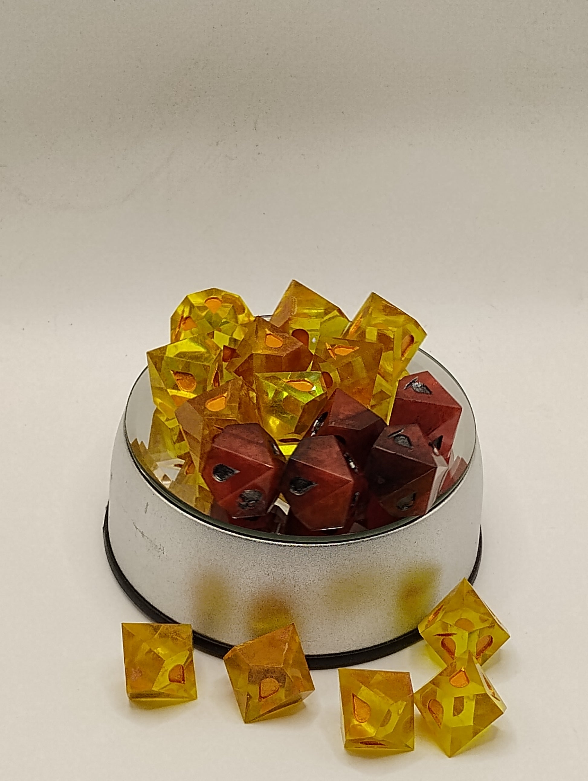 Immerse yourself in the world of darkness and decadence with this stunning, handcrafted Vampire: The Masquerade dice set. Rich, bloody red meets luxurious gold in these exquisite dice, designed to evoke the essence of power, betrayal, and bloodlines. The fiery red symbolizes the pulse of the Kindred, while the gleaming gold hints at the wealth and influence of the most ancient vampires. Every die is meticulously inked with fine detailing, making each roll a moment of intrigue and fate. Perfect for Vampire: The Masquerade campaigns, these dice offer a bold, elegant touch to your gaming table. Elevate your TTRPG experience and let these dice be the key to unlocking your next dark, unforgettable tale.
