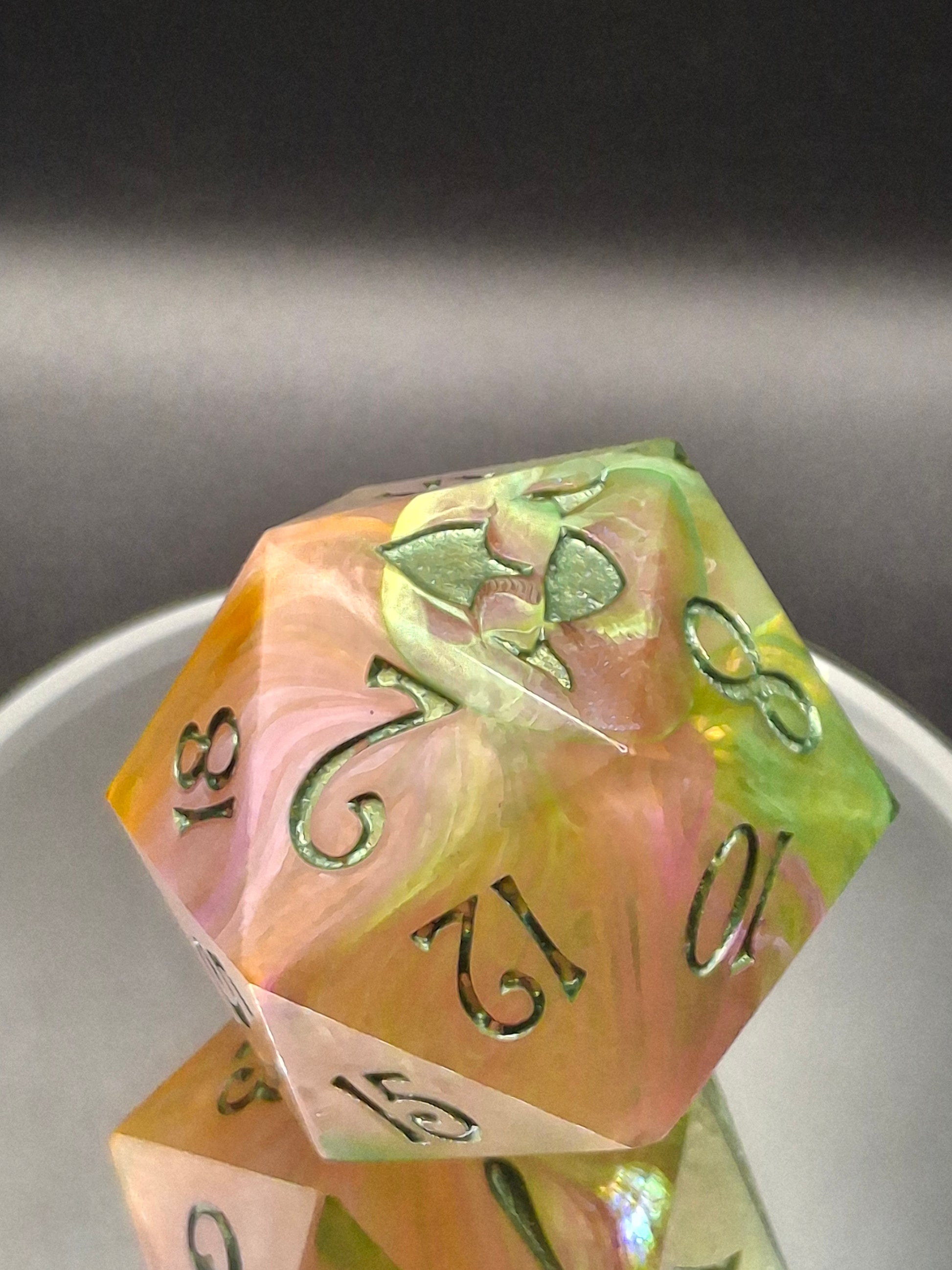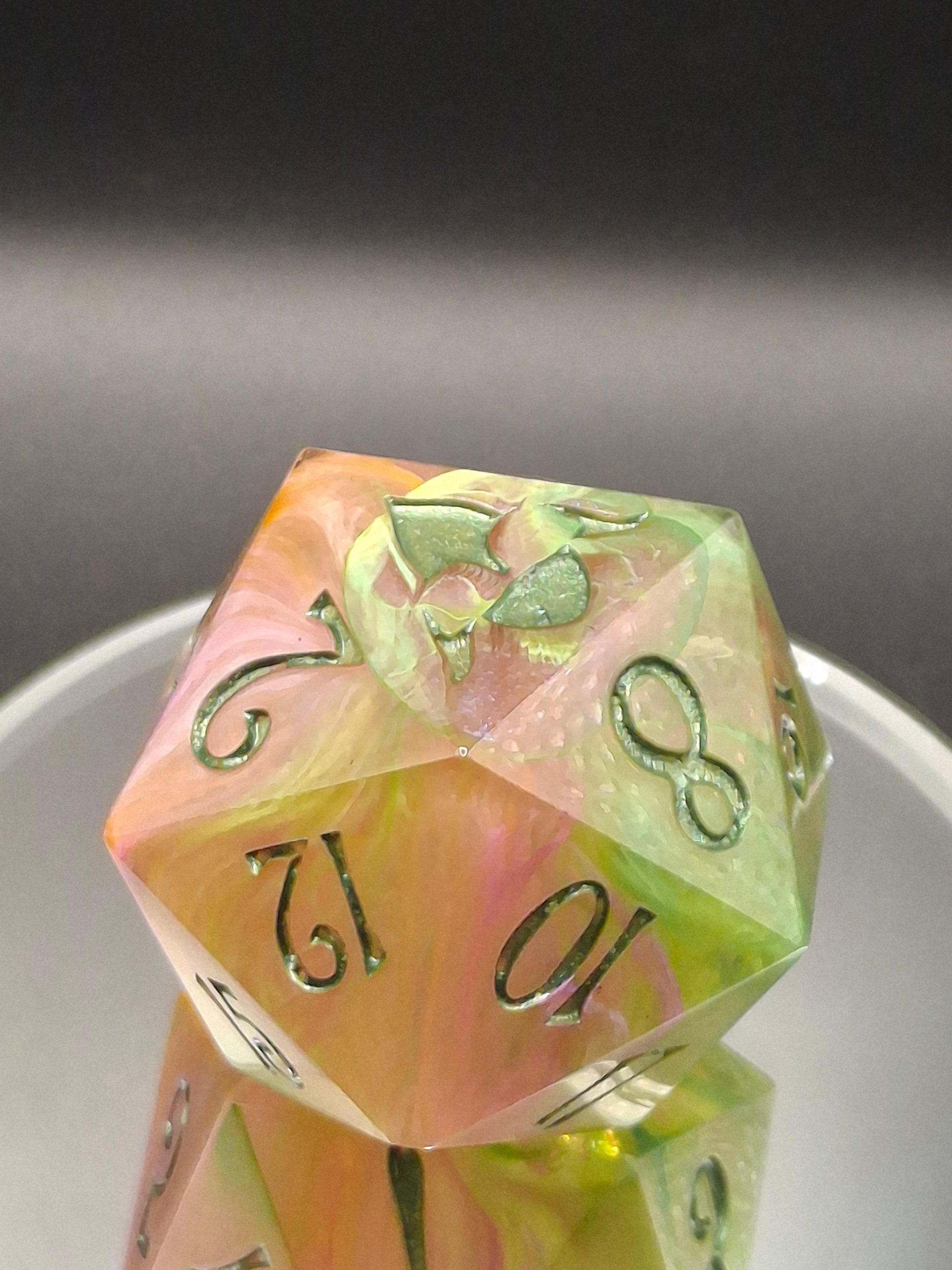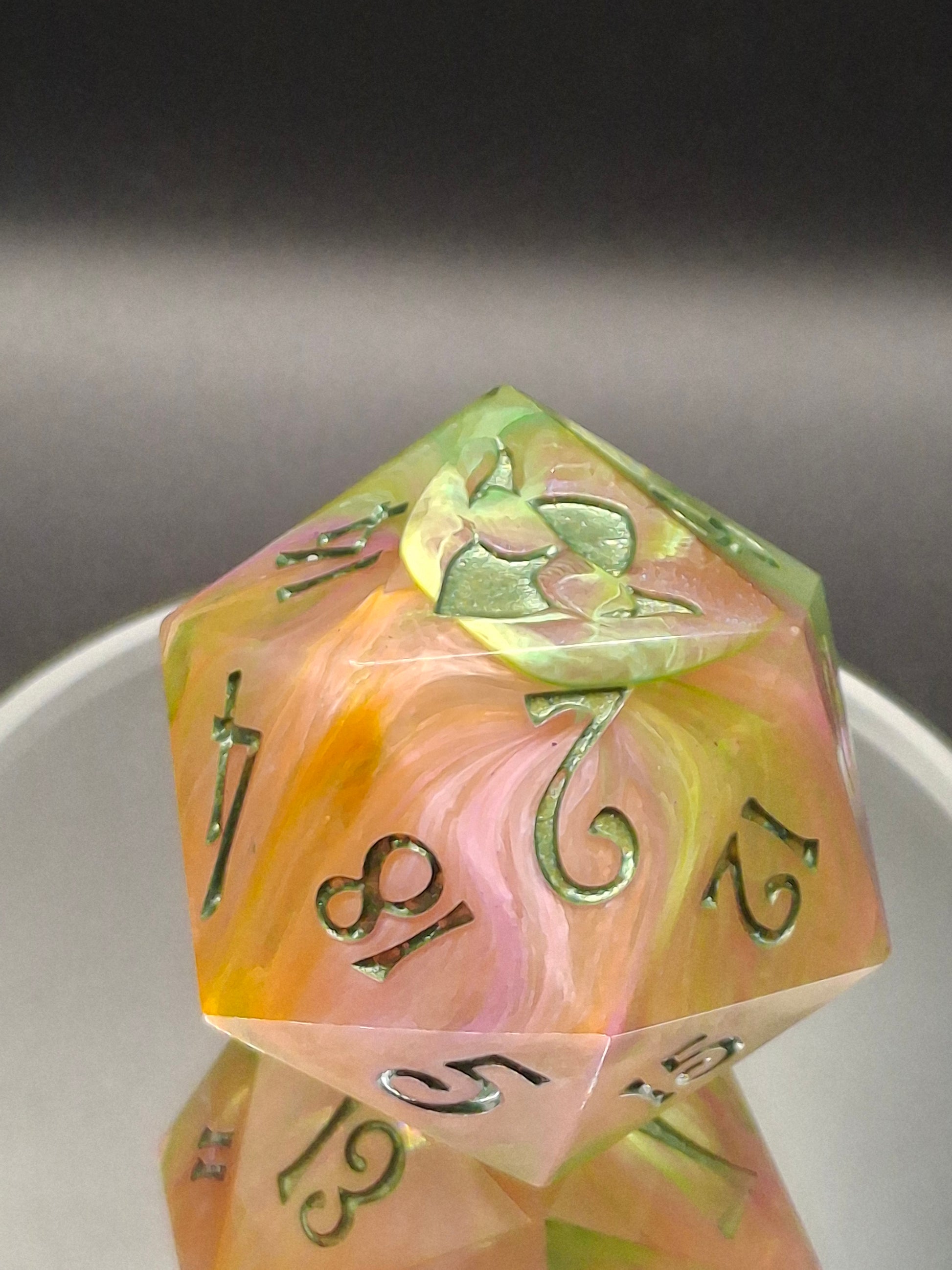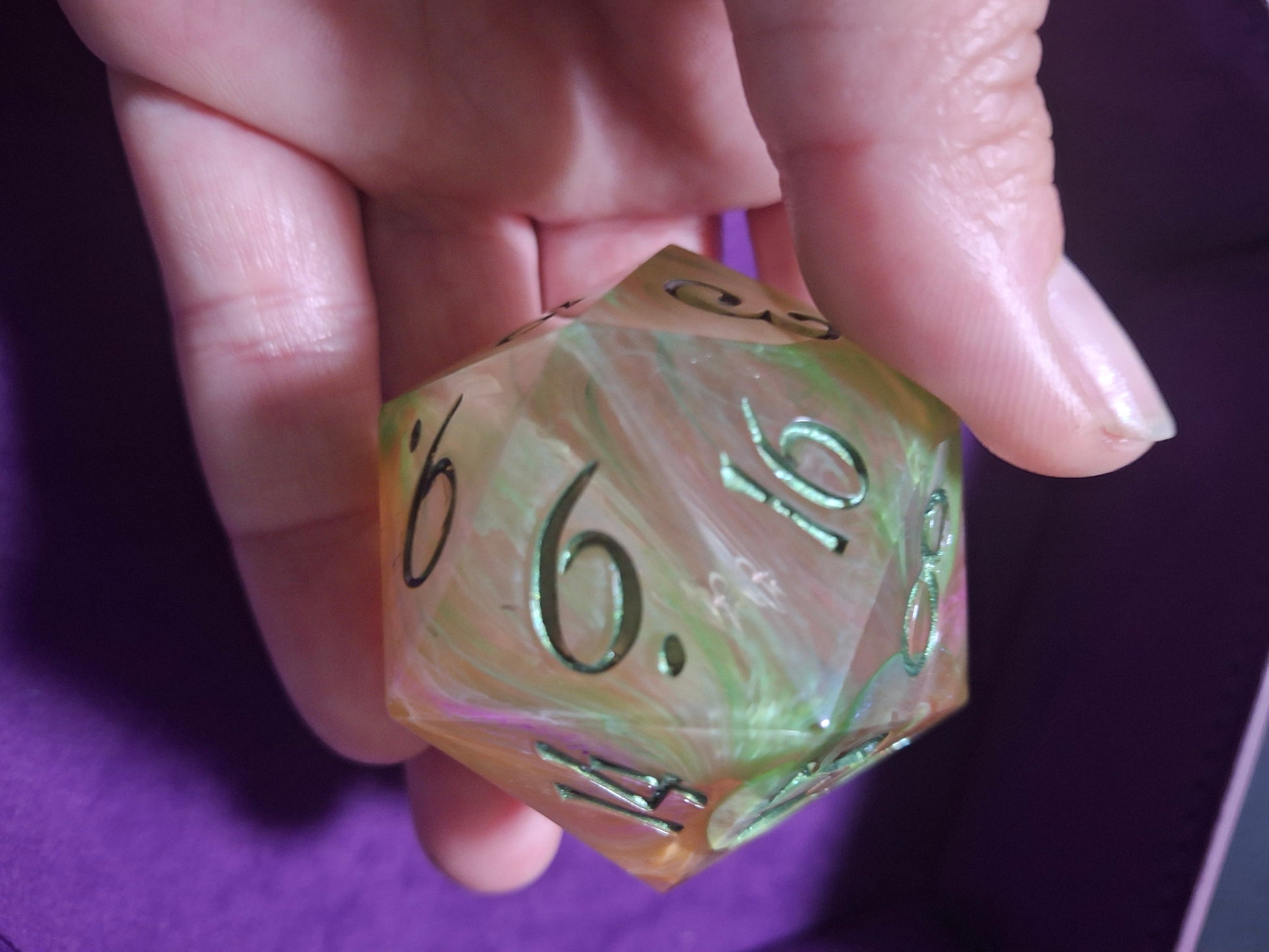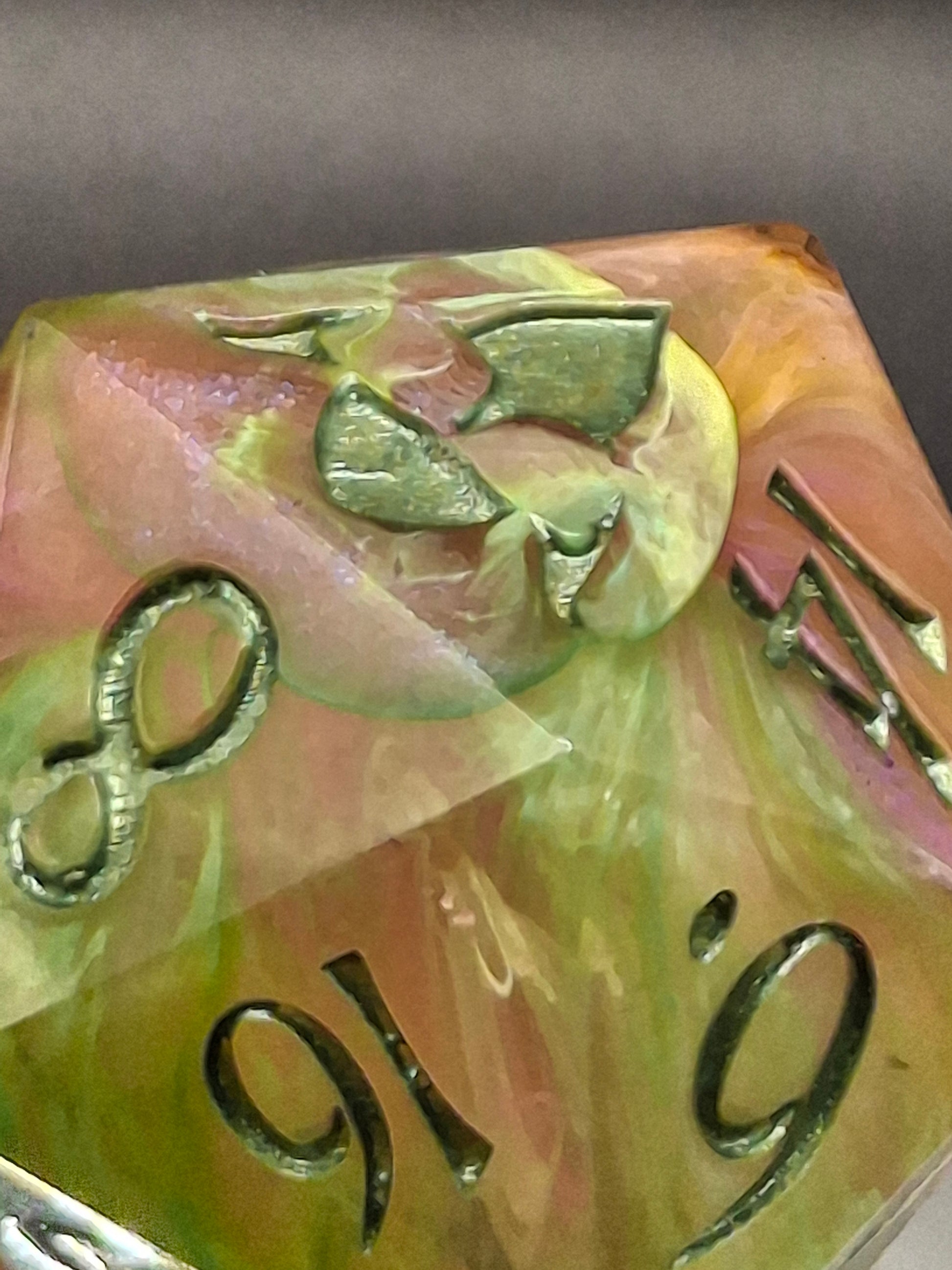 As you cradle this unique die in your hands, you will experience the impeccable craftsmanship that goes into each piece. Vivid swirls of colors dance from green to gold to subtle hints of pink, echoing the vibrant landscapes you'll traverse in your favorite campaigns. The combination of colors brings a dynamic, fluidic appearance, making each die genuinely one-of-a-kind. You won’t just roll a number; you’ll roll a piece of art!