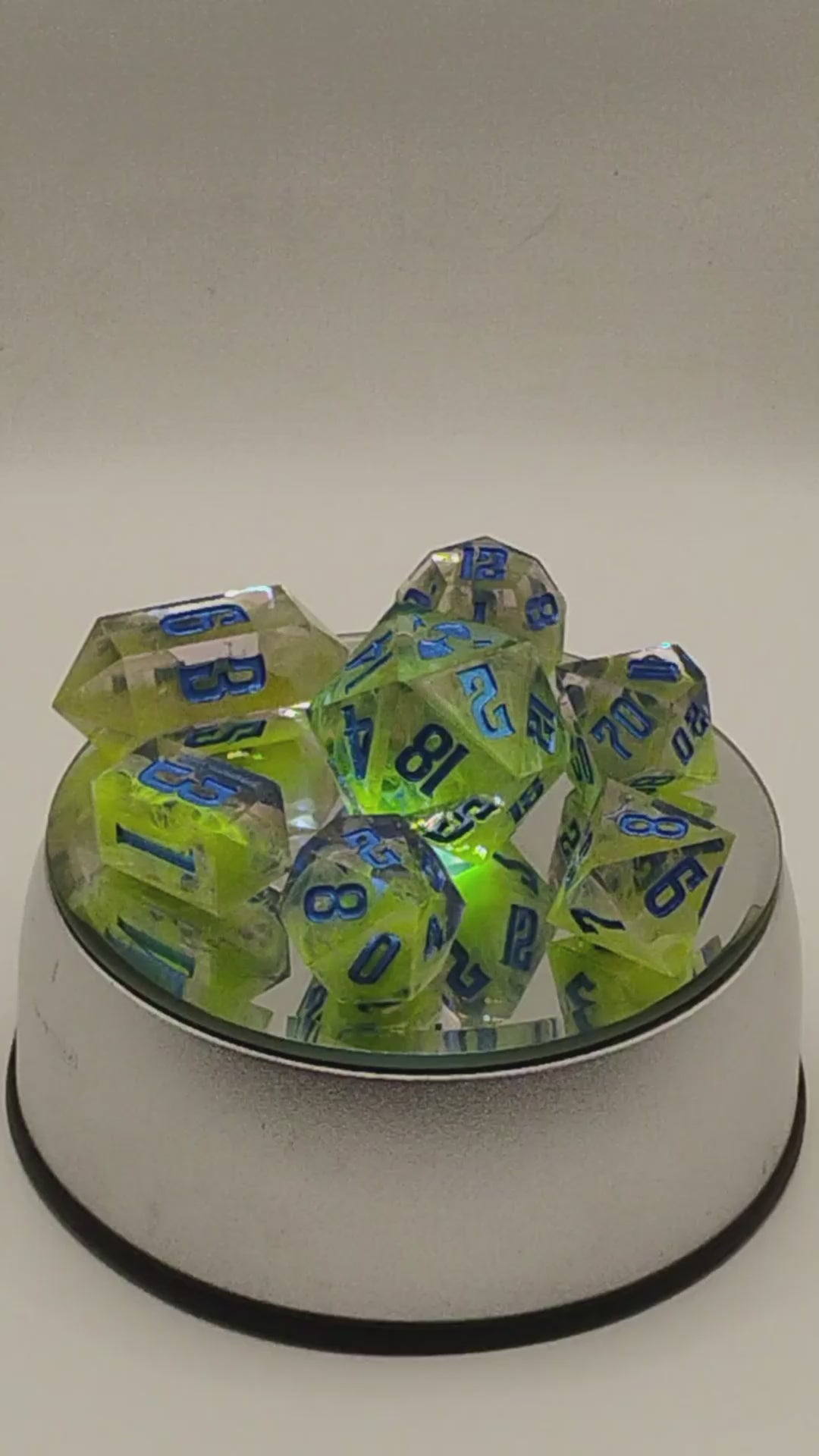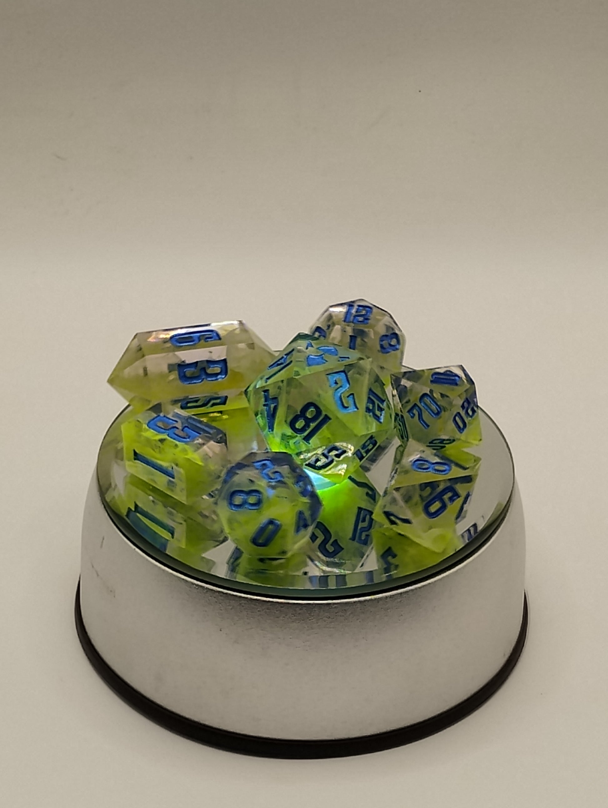 Born of alchemy and madness, the Plagueglass Prism dice shimmer with unholy light — a toxic radiance caged in crystal. Their sickly green glow hums beneath a veil of blue sigils, like forbidden runes pulsing with arcane contagion. Each roll feels like a gamble with something that should not be touched, let alone worshipped.