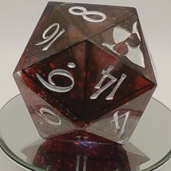 Ravenheart Monolith – 78mm Handmade Chonk D20 with Red Glitter and Ghostly Raven Skull Core