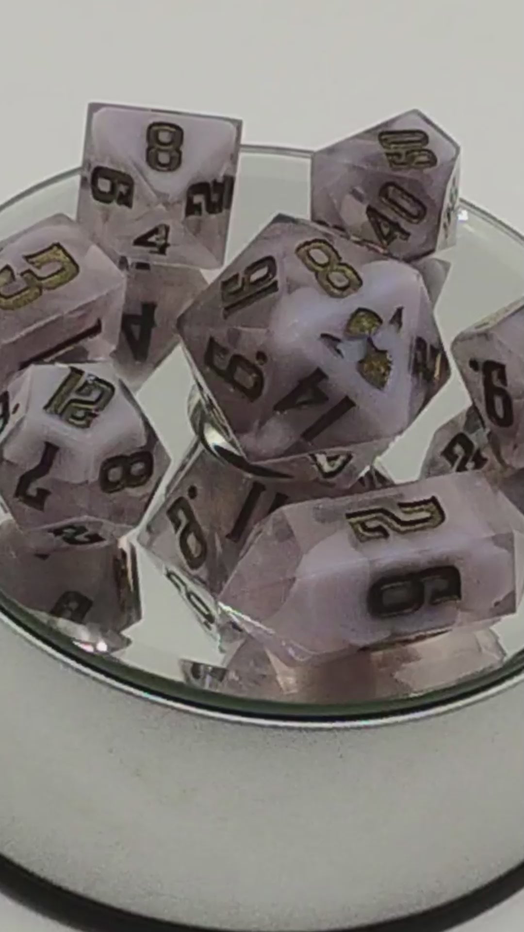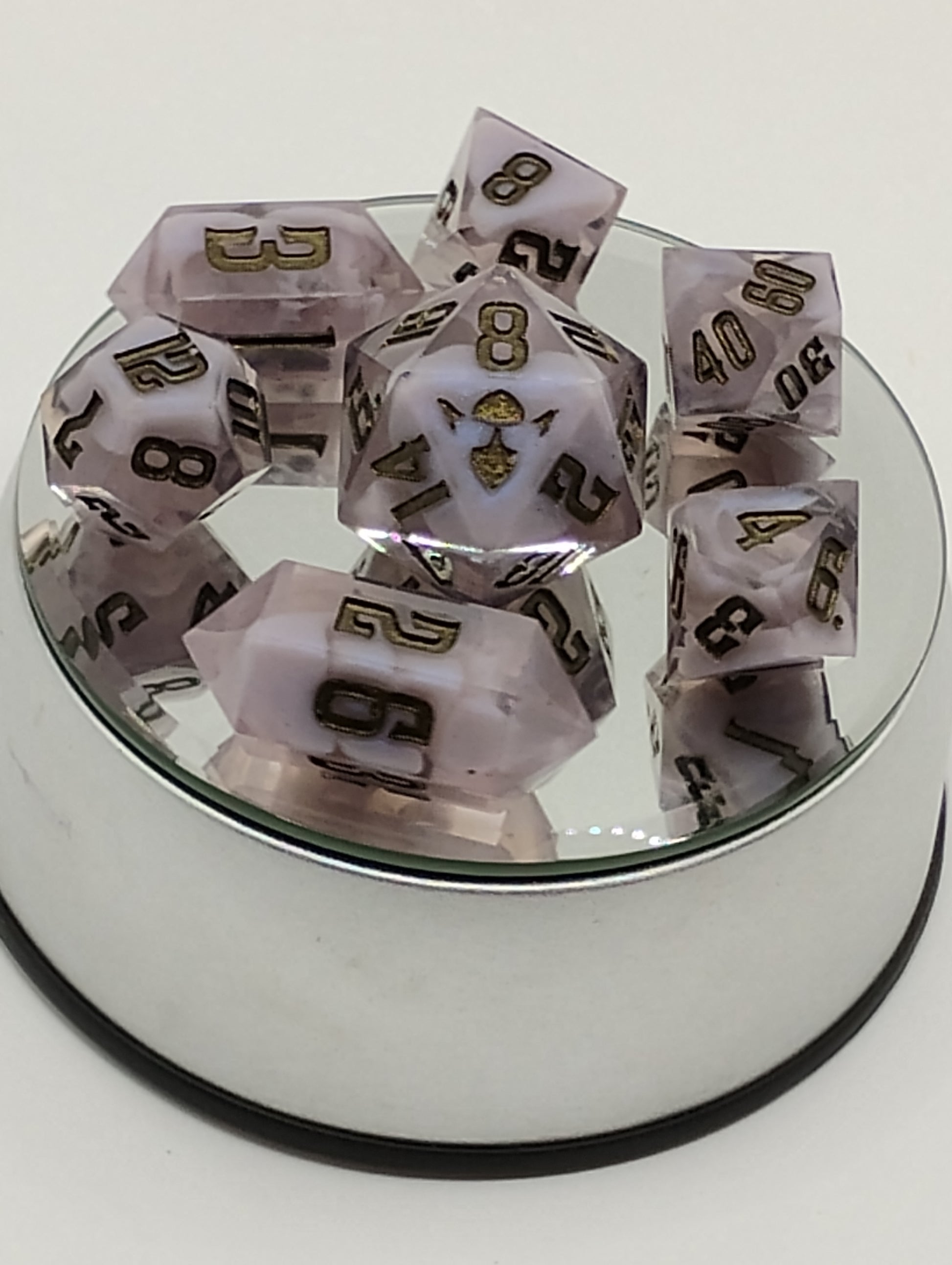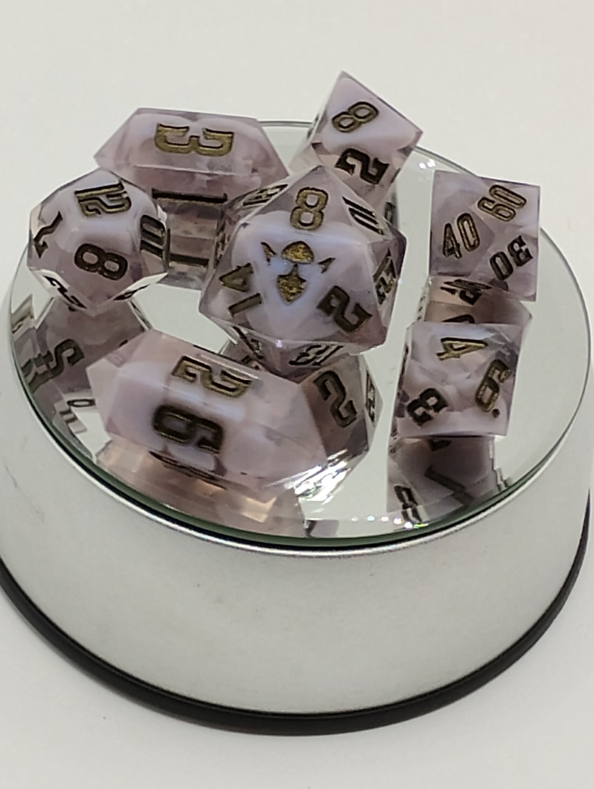 d4, d6, d8, d10, d%, d12, and a razor-sharp d20 — each one unique, never to be made again.