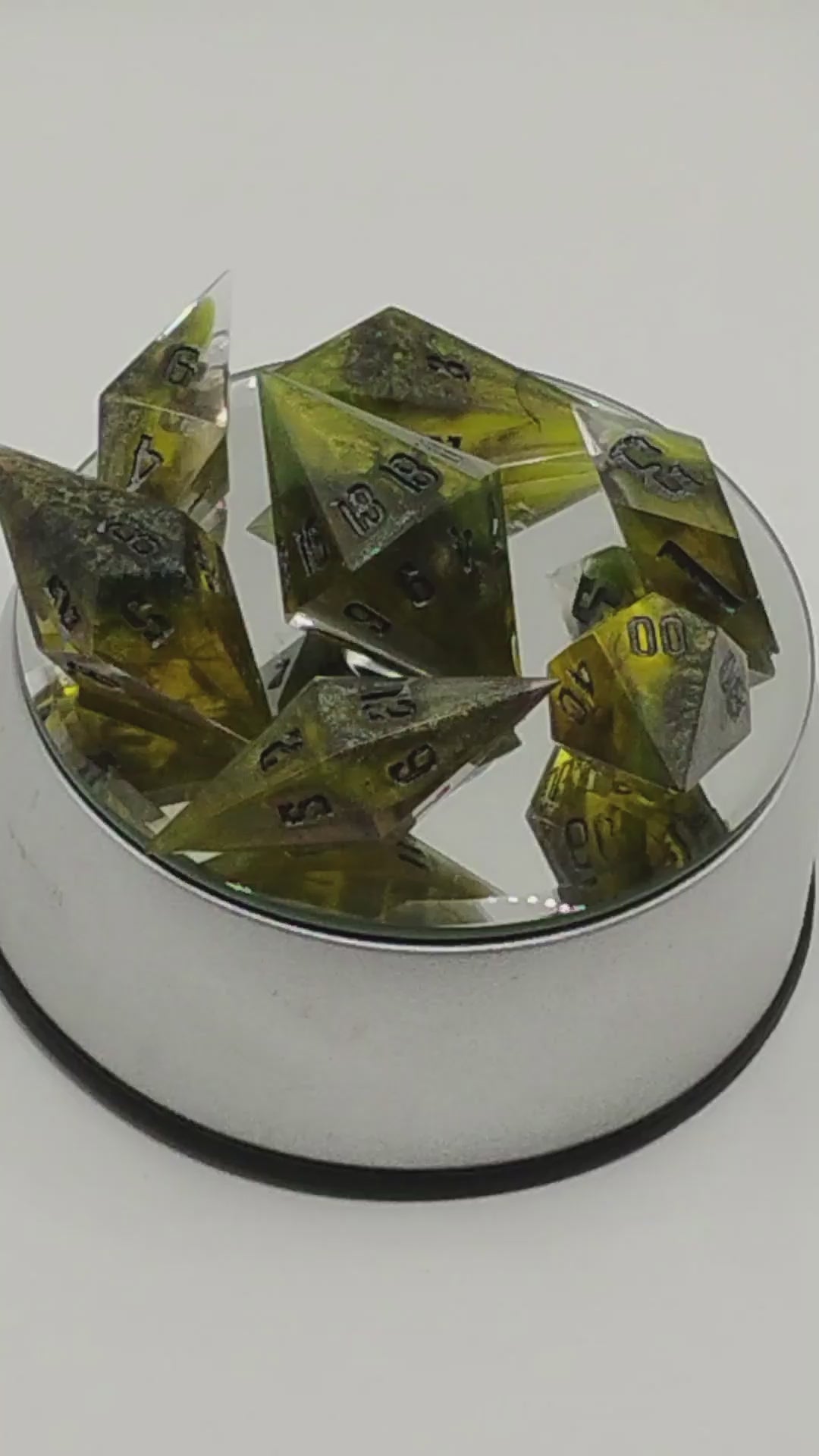 Hand-poured in earthy olive resin, streaked with charcoal grey shadows, every shard catches the light like a fragment of an ancient idol. Each piece has been sanded, polished, and inked by hand by Nat20Dicery — sharpened edges honed to perfection.